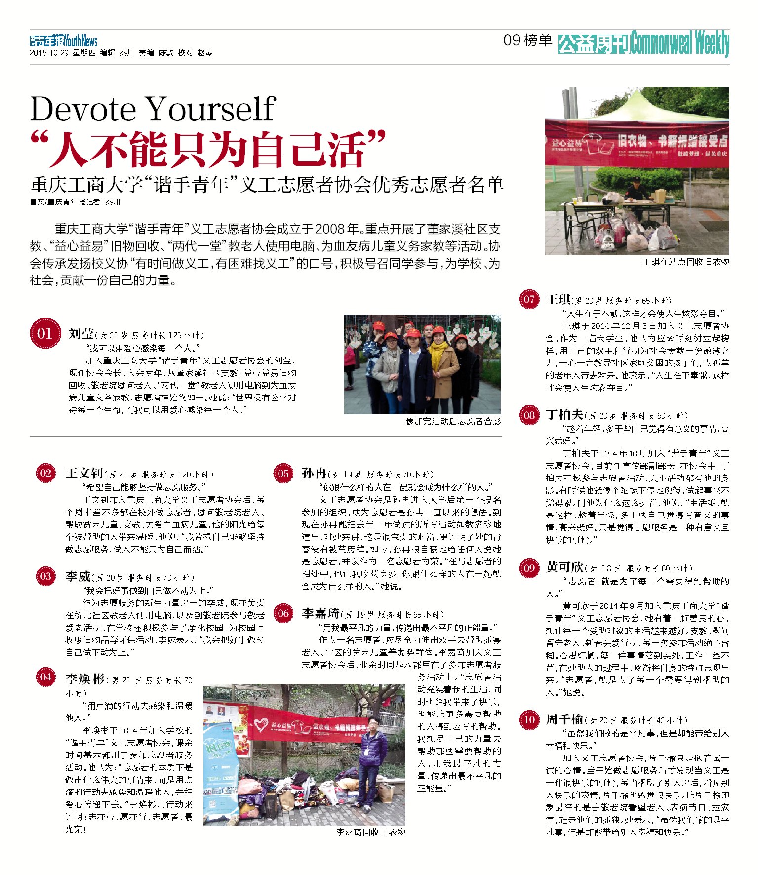 金年会艺术学院影视动画分院于2008年成立“谐手青年”义工志愿者协会。一直以来,全体志愿者们全心全意致力于为社会贡献自己的爱心与力量!重点开展了董家溪市民学校支教、“益心益易”旧物回收、“两代一堂”教老人使用电脑、为血友病儿童义务家教等活动。该义协传承校义协“有时间做义工,有困难找义工”的口号,积极号召同学们参与志愿者服务活动,为学校、社会奉献自己的青春和力量。重庆青年报于 2015年10月29日在公益周刊...