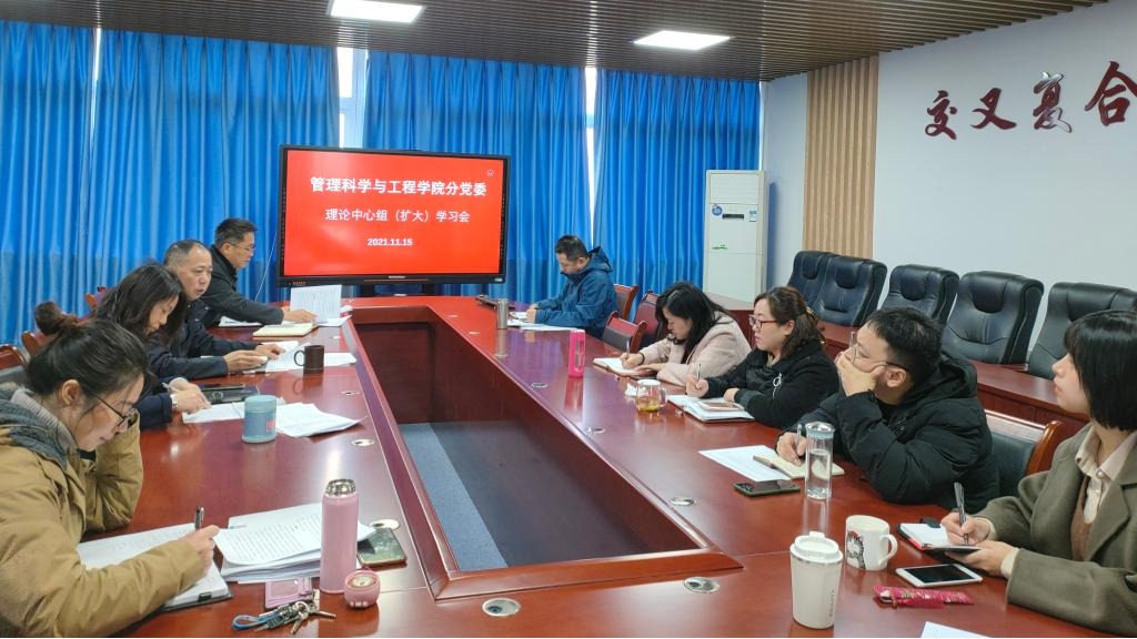 11月15日,管理科学与工程学院党委理论学习中心组召开扩大会议,集中学习中共十九届六中全会精神。学院党委委员参加学习,学院非党员班子成员、师生党支部书记列席了本次学习会。党委书记邓德敏主持会议并领学《中国共产党第十九届中央委员会第六次全体会议公报》(以下简称《公报》)精神。邓德敏在领学中指出,十九届六中全会是走过百年历程的中国共产党在重要历史关头召开的一次具有重大历史意义的会议。全会审议通过的《中...