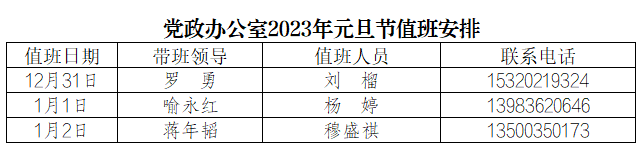 为更好地服务全校师生,保障元旦节期间学校相关工作顺利开展,党政办公室每天均安排值班人员,负责学校党委印章、校章、法人印章、学校合同章、党政办公室印章等用印,学校介绍信开具,公文签发审核,会议室申请及使用等工作,请需求单位或师生按规定流程履行签批手续,其他未尽事宜,请与值班老师联系。