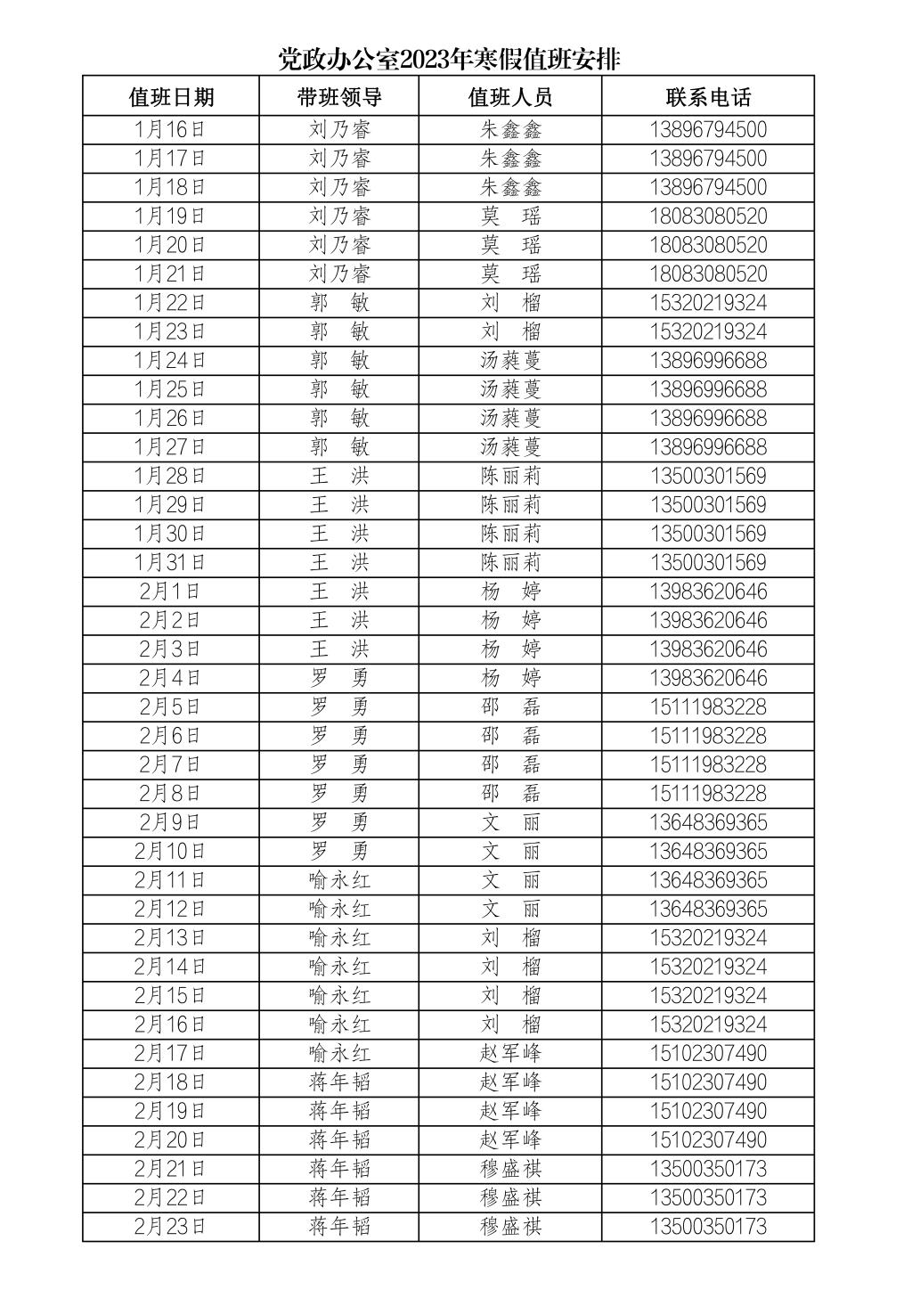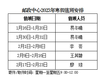 为更好地服务全校师生,保障寒假期间学校相关工作顺利开展,党政办公室每天均安排值班人员,负责学校校章、党委印章、法人印章、学校合同章、党政办公室印章等用印,学校介绍信开具,公文签发审核,会议室申请及使用等工作,请需求单位或师生按规定流程履行签批手续,其他未尽事宜,请与值班老师联系。