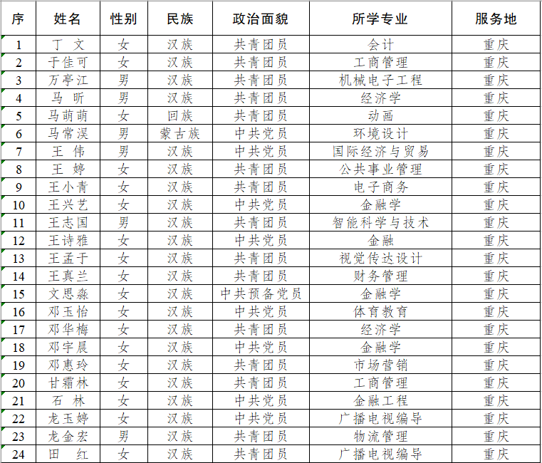 按照重庆市西部计划项目办的统一部署和安排,经学生本人报名、各学院推荐、校团委审核、重庆市各区县项目办招募考核等环节,根据市项目办的反馈,金年会入围2023年西部计划市内服务共104人,现将名单公示如下: