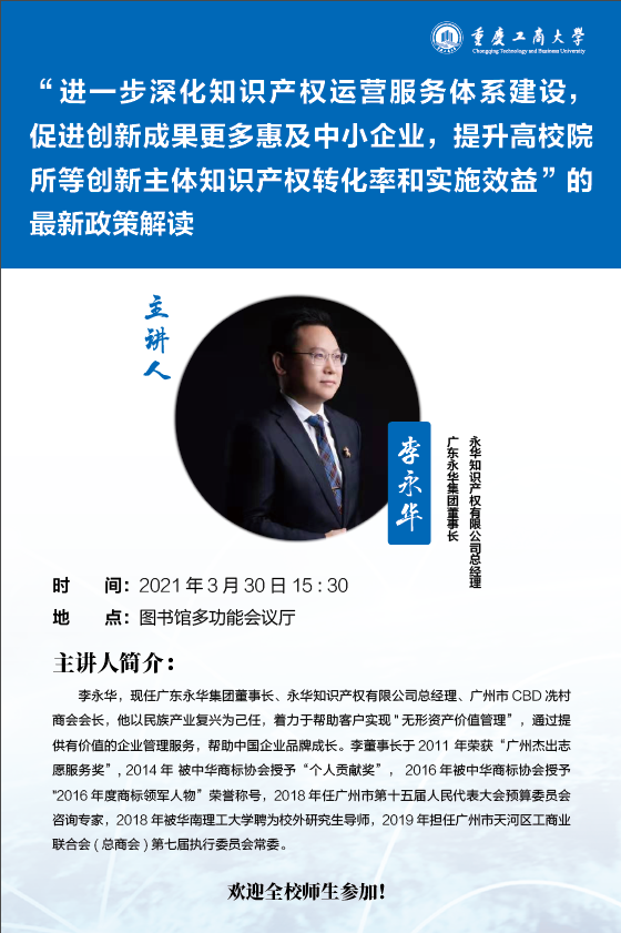 为推进知识产权强校建设,促进金年会科技创新,加快科技成果的转化,为广大师生开展创新活动提供更好、更专业的服务,JINNIAN金年会科技成果转化中心和会计学院共同举办“进一步深化知识产权运营服务体系建设,提升高校院所等创新主体知识产权转化率和实施效益”的最新政策解读讲座,现将有关事项通知如下: