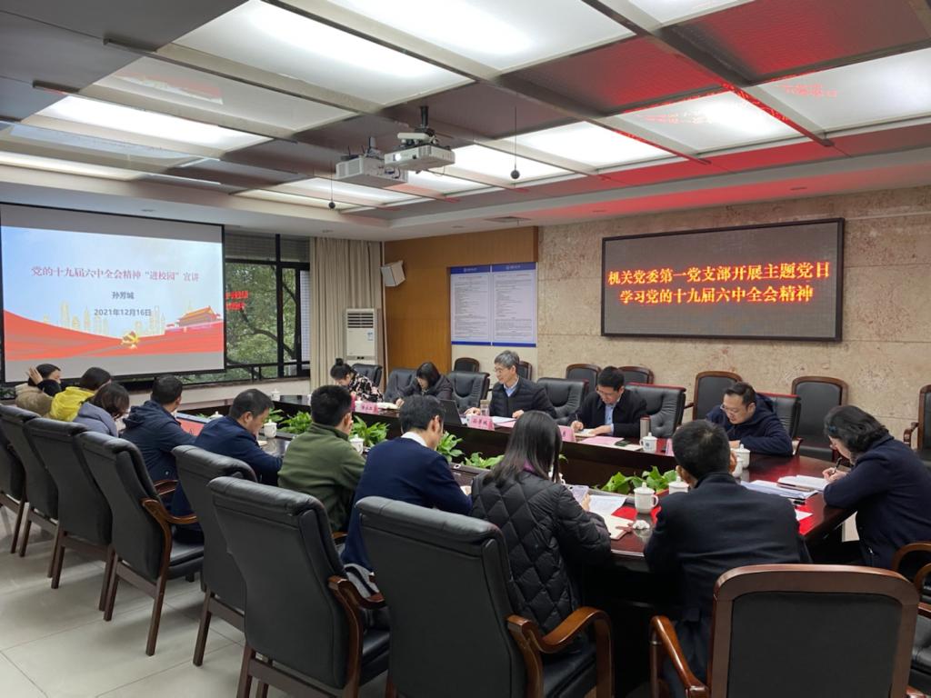 12月16日上午,党委副书记、校长孙芳城在厚德楼3019会议室为机关党委第一党支部宣讲党的十九届六中全会精神。支部全体党员参加学习。