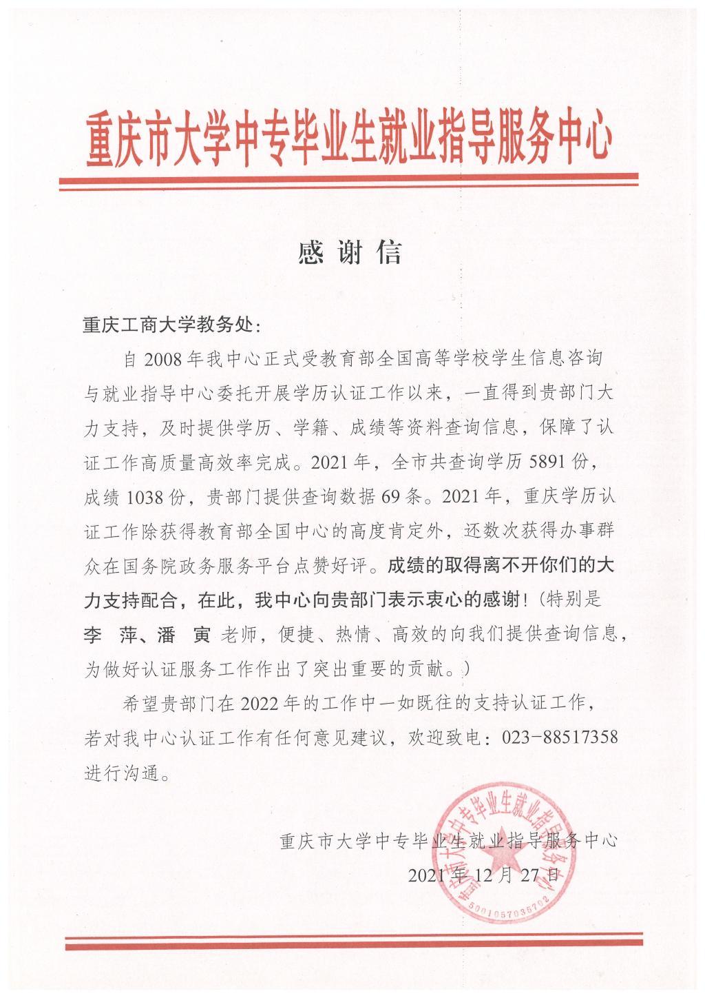 近日,重庆市大学中专毕业生就业指导服务中心向金年会教务处发来感谢信,对金年会在2021年的学籍管理工作和相关教师作出肯定和表扬。学校学籍管理工作人员常年为校友提供学历、学籍、成绩等方面的服务,得到了相关部门和广大校友的肯定。