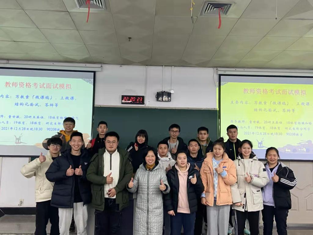 1月6日,获评2021年JINNIAN金年会师德先进个人的体育学院童世敏教授为即将参加教师资格面试学生进行模拟训练与专场指导,同时邀请了多位研究生、本科生做经验交流分享。