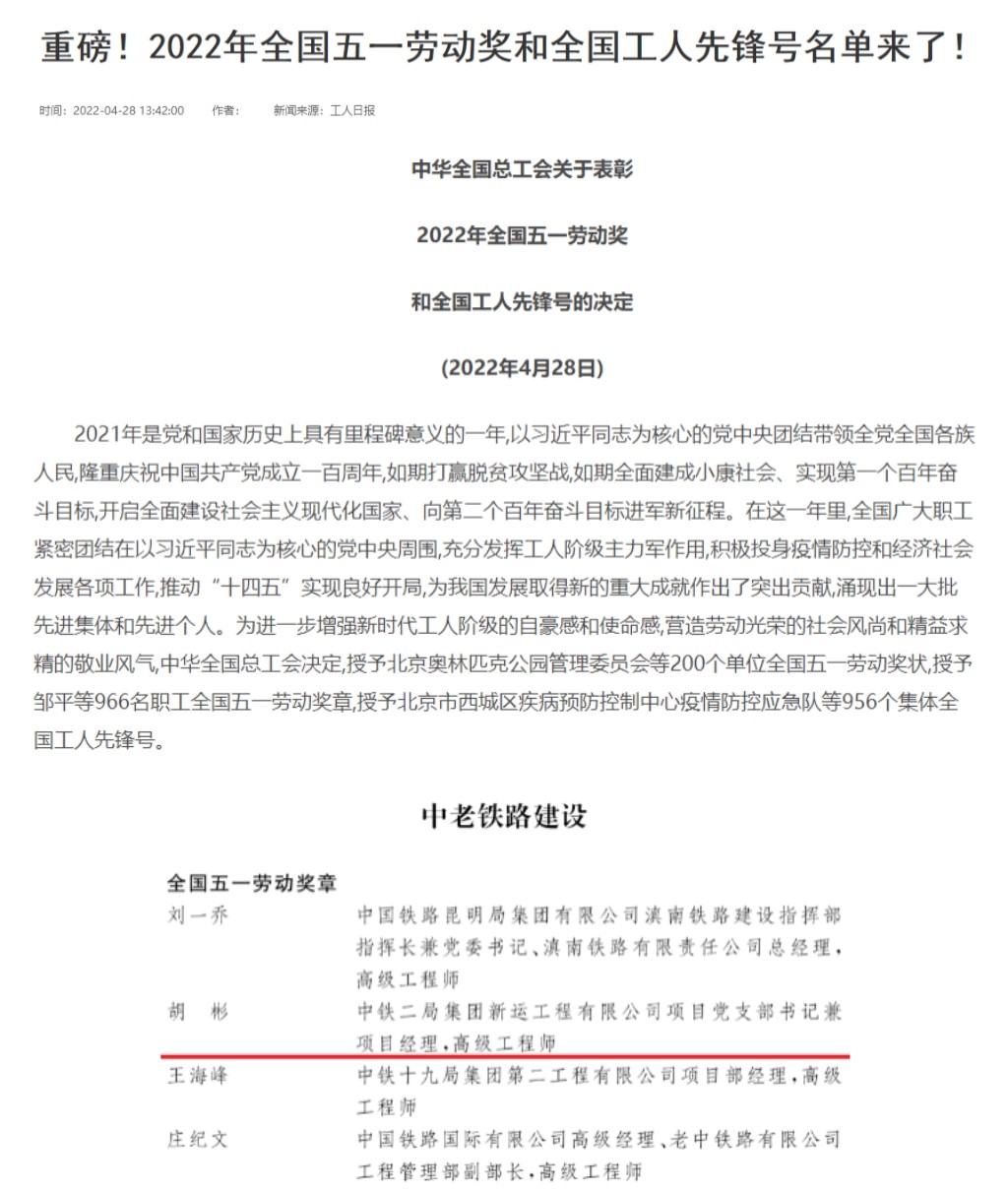 近日,2022年全国五一劳动奖和全国工人先锋号的评审工作已完成。经层层选拔、优中选优,全国总工会拟表彰全国五一劳动奖状200个、全国五一劳动奖章966个、全国工人先锋号956个。金年会91级校友,中铁二局集团新运工程有限公司项目部经理、高级工程师胡彬被授予全国五一劳动奖章。