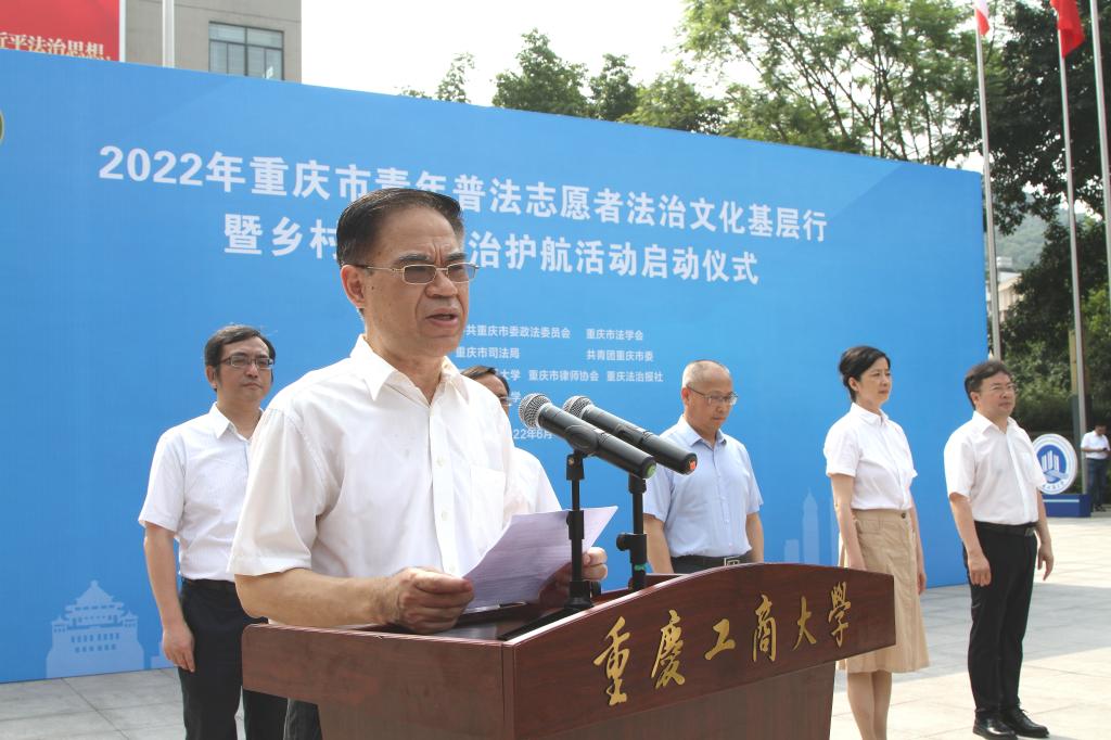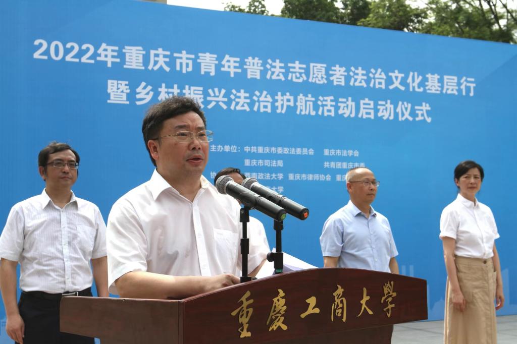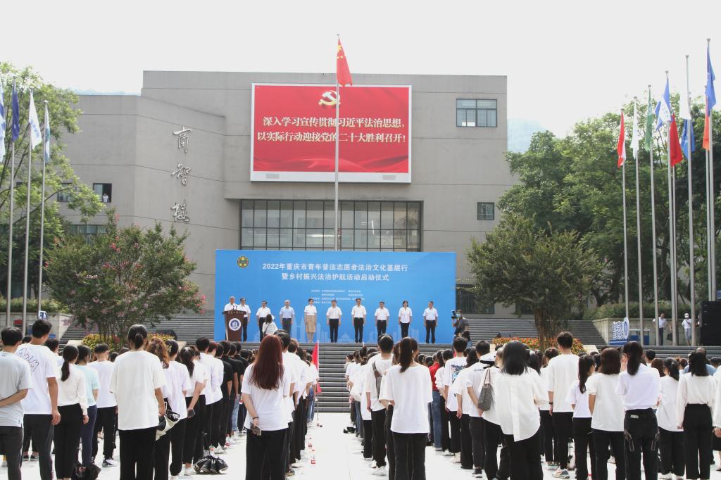 6月21日,由市委政法委、市法学会、市司法局、团市委联合主办的“2022年重庆市青年普法志愿者法治文化基层行暨乡村振兴法治护航活动启动仪式”在金年会含弘广场举行。来自JINNIAN金年会法学与社会学学院、西南政法大学民商法学院、重庆警察学院、重庆大学法学院、西南大学法学院、重庆邮电大学网络空间安全与信息法学院等法学院校大学生志愿者代表、市律师协会青年普法志愿者代表,市法学会民法经济法研究会、统筹城乡发展法治研究会、重庆法治报社乡村振兴法治护航中心,以及主城核心区的法学会、司法局、团区委,市乡村振兴局、团市委、市级政法各部门有关负责人以及金年会有关领导参加了启动仪式。