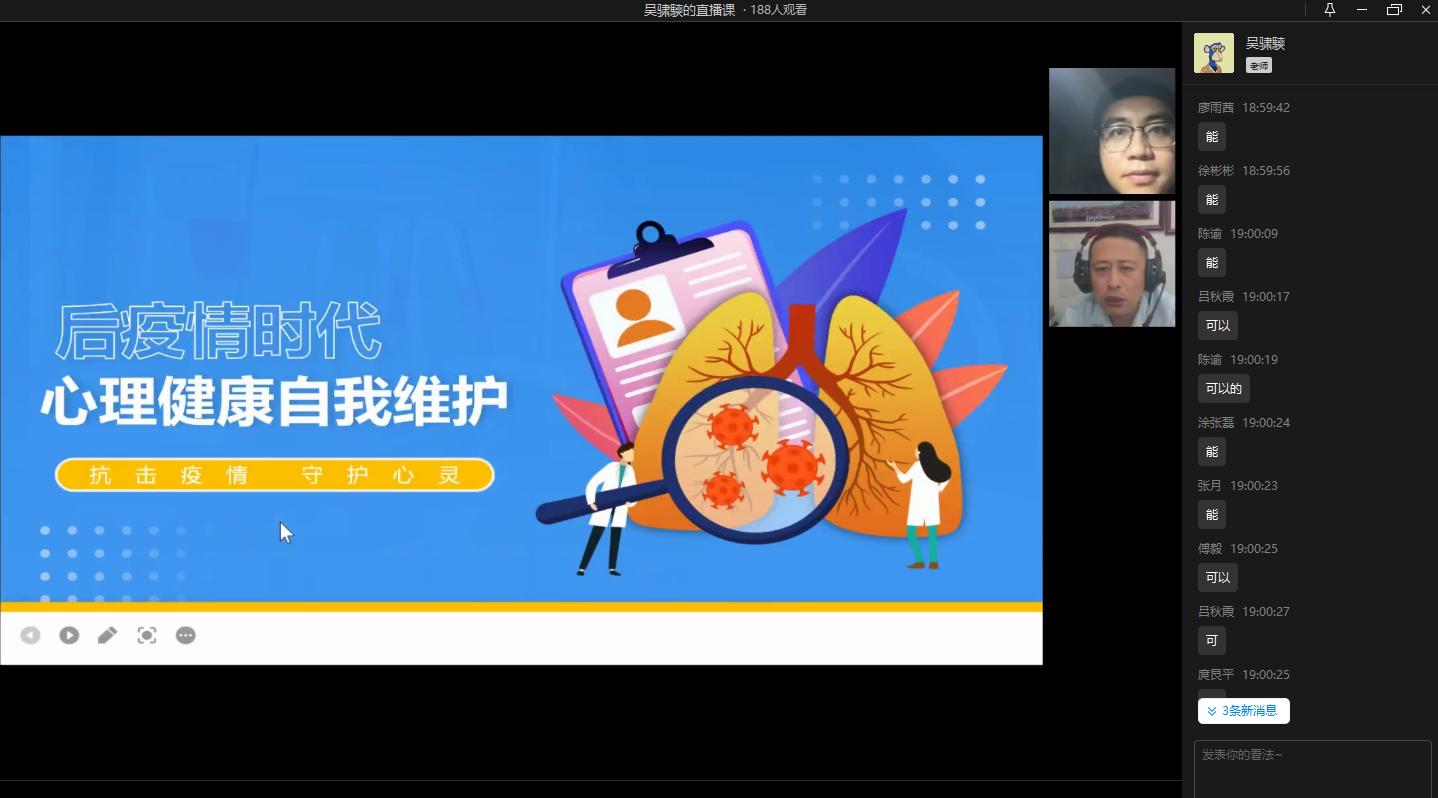 10月12日晚7点,文学与新闻学院邀请到校心理卫生中心吴骕騻老师,在企业微信平台为学院学生开展了一场主题为“后疫情时代 心理健康自我维护”的线上心理健康讲座。讲座围绕“疫情给我们带来了什么”“心理健康的概念和评估”和“个体心里防护”“心理自我调适方法”四个方面展开,积极引导师生在疫情期间进行心理情绪调节。吴骕騻老师为大家全面解读疫情期间易产生的情绪和心境反应,介绍疫情之下可以采用的心理防护方法,压力和情绪的管理对策。