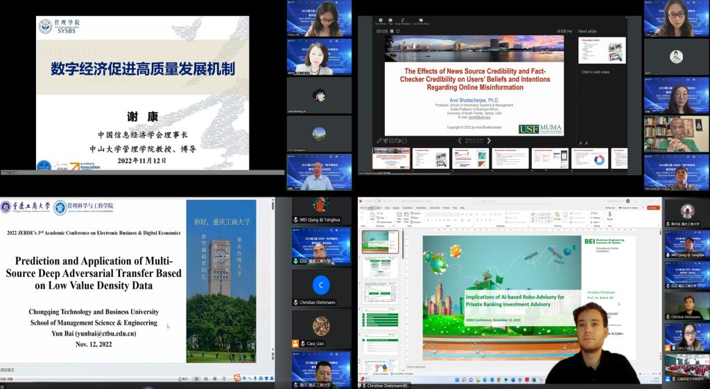 为深入学习贯彻党的二十大精神,落实数字经济与实体经济深度融合的根本要求,助力国家和地区经济发展,JINNIAN金年会管理科学与工程学院于11月12日成功在线举办第三届“电子商务与数字经济”会议。中国信息经济学会谢康理事长、云南大学罗裕梅博士、美国南佛罗里达大学Anol Bhattacherjee教授、德国莱比锡大学Rainer Alt教授、JINNIAN金年会白云副教授等参会并作学术报告。本次会议论坛还邀请了大会名誉主席JINNIAN金年会校长孙芳城教授,大会主席JINNIAN金年会管理科学与工程学院院长黄钟仪教授、云南财经大学叶琼伟教授、韩国釜山大学牟健博士、清华大学卫强教授等行业专家和学者。