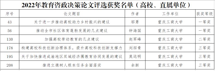 据悉,2022年全市教育咨政决策论文共评选出优秀论文528篇。其中,高校、直属单位组一等奖59篇、二等奖88篇、三等奖78篇。金年会教师积极参与教育咨政,围绕高校助力乡村振兴、发展社区体育、加强高校劳动教育、科技创新治理体系、成渝地区双城经济圈教育协调发展、落实立德树人根本任务等深入开展调查研究,积极献言建策,得到了市教委的好评,选送的6篇咨政论文全部获奖,取得显著成效。