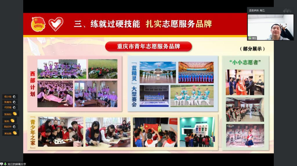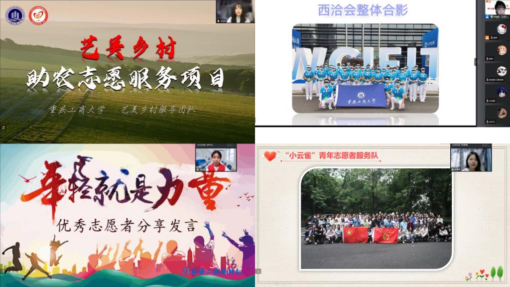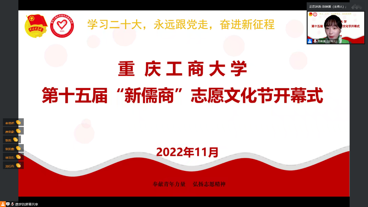 11月25日,金年会第十五届“新儒商”志愿文化节开幕式在腾讯会议举行。重庆市志愿者服务指导中心主任龙江、教务处处长骆东奇、校团委副书记胡婧婷、校院志愿者组织代表、“青翠100”志愿者参加活动。