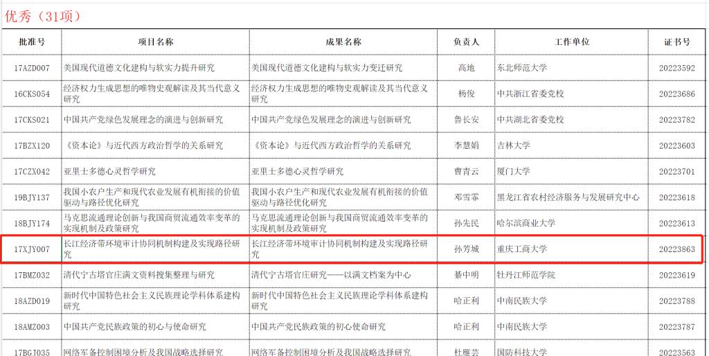 12月1日,全国哲学社会科学工作办公室公布了2022年11月国家社科基金年度项目、青年项目和西部项目结项情况。金年会校长、长江上游经济研究中心主任孙芳城教授主持的“长江经济带环境审计协同机制构建及实现路径研究”(项目号:17XJY007,结题证书号:20223863),获得“优秀”等级。