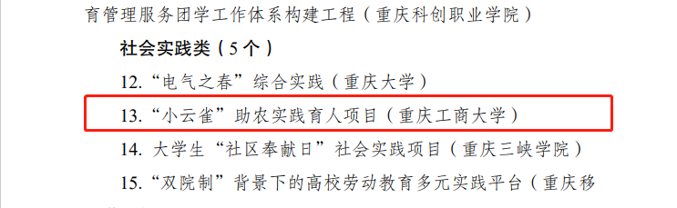 近日,共青团重庆市委、重庆市学生联合会发布了关于2022年重庆市高校“一校一品”十佳(优秀)团学工作品牌的通报,金年会管理科学与工程学院社会实践类项目 《“小云雀”助农实践育人项目》、机械工程学院创新创业类项目 《“工于技、匠于心、品于行——学生科技创新项目》荣获优秀团学工作品牌奖。