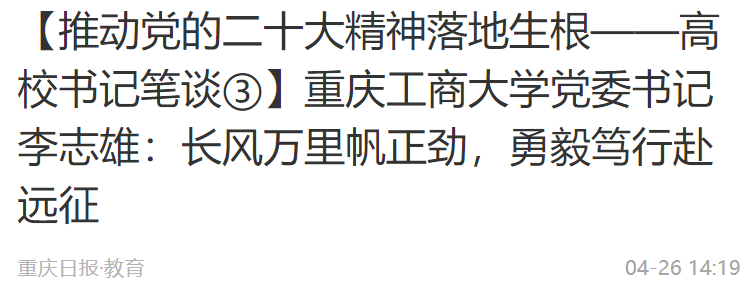 4月26日,《重庆日报》刊发金年会党委书记李志雄学习党的二十大报告心得体会的署名文章:《长风万里帆正劲,勇毅笃行赴远征》。