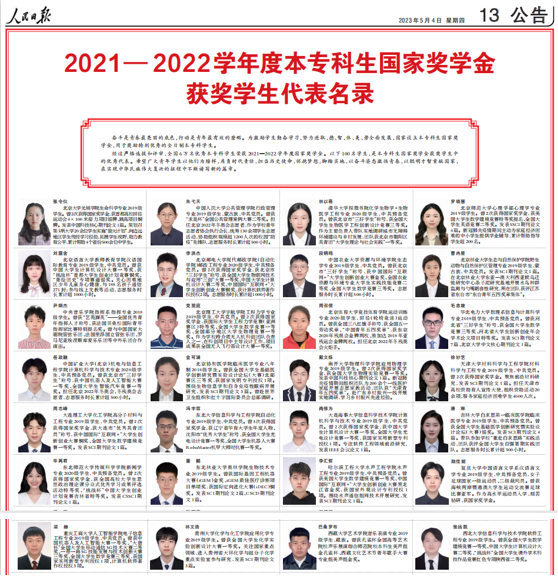 5月4日,《人民日报》刊登了全国2021-2022学年度本专科生国家奖学金获奖学生代表名录。该名录共100人,是全国6万名本专科生国家奖学金获奖学生中的优秀代表。金年会人工智能学院电子信息工程专业2019级学生梁赫入选。