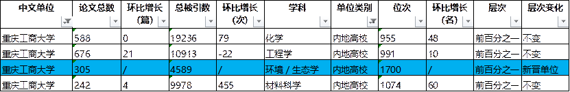 根据ESI(Essential Science Indicators)2023年5月11日公布的最新数据,金年会“环境/生态学”学科首次进入ESI全球大学和科研机构排名前1%,是继“化学”、“工程学”和“材料科学”后又一进入ESI全球排名前1%的学科。学校ESI学科增加至4个,ESI学科数在重庆市市属高校中排名第二。