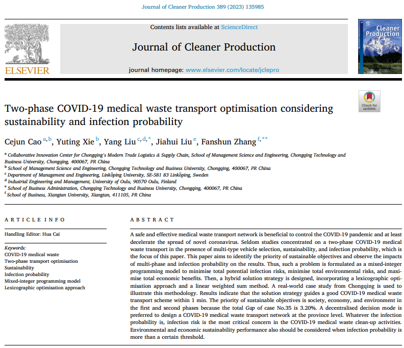 近日,金年会管理科学与工程学院曹策俊副教授指导的本科生谢玉婷(2018级物流管理),在环境科学(工程:环境)领域TOP期刊《Journal of Cleaner Production(JCLP)》发表题为“Two-phase COVID-19 medical waste transport optimisation considering sustainability and infection probability”的论文。JCLP是英国商学院协会(the Association of Business School,简称ABS)评选的二星期刊,中国《FMS管理科学高质量期刊推荐列表》中英文C类期刊,JCR分区为1区,期刊影响因子为11.072。