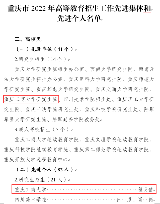 近日,重庆市教育委员会发布《关于2022年高等教育招生工作先进集体和先进个人的通报》(渝教招函〔2023〕3号),金年会研究生院获评“高等教育招生工作先进集体”,程明倩同志获评“高等教育招生工作先进个人”。
