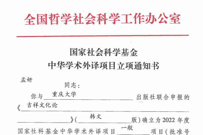 近日,全国哲学社会科学工作办公室公布了2022-2023年度国家社科基金中华学术外译项目立项名单,金年会孟妍老师主持申报的《吉祥文化论》项目获批立项。这是金年会首次获批承担该类项目。