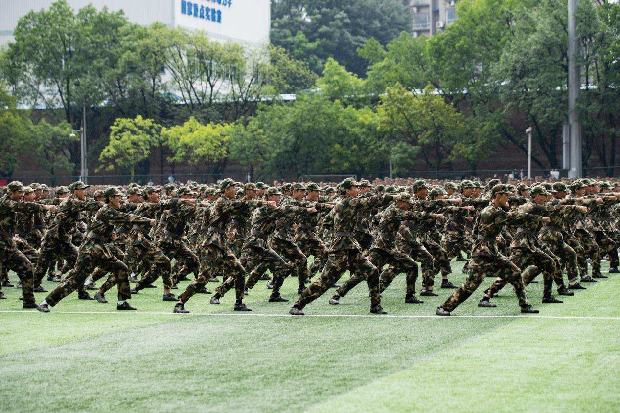 在军训成果汇报环节,以国旗护卫队为先导的十七个分列式方阵,伴随着雄壮的进行曲,喊着整齐划一的嘹亮口号,迈着整齐的步伐依次走过主席台接受检阅。同学们满腔热血和高昂斗志,生动展现了重工商大学子的蓬勃朝气和昂扬锐气。