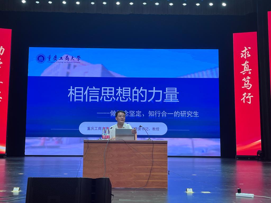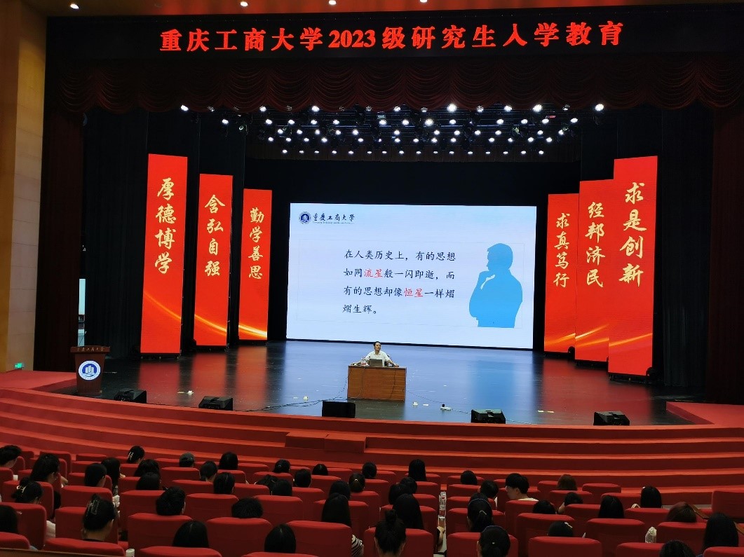 9月8日上午,马克思主义学院党委书记、副院长、硕士生导师宋明江教授以“相信思想的力量——做信念坚定、知行合一的研究生”为题向全体研究生新生讲授了第一课。宋明江首先以“怀大局,观大势,行大道”九字箴言寄语新同学,表达了他对同学们的殷切期盼和衷心祝愿。随后从“立足两个大局、把握时代方向”“坚持问题导向、提高认知能力”“勇担时代责任、贡献青春力量”三个方面为同学们阐述了怎样做一个躬身实践、知行合一的研究生,并殷切期盼新同学们:生逢盛世当不负盛世,生逢其时必奋斗其时,不断向上向善,勇于筑梦,勤于追梦,善于圆梦,在这片沃土上继续书写华丽篇章。