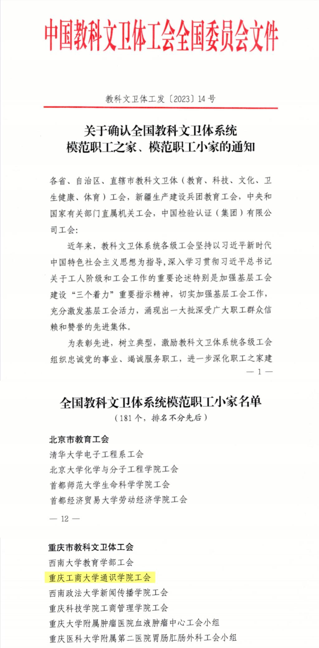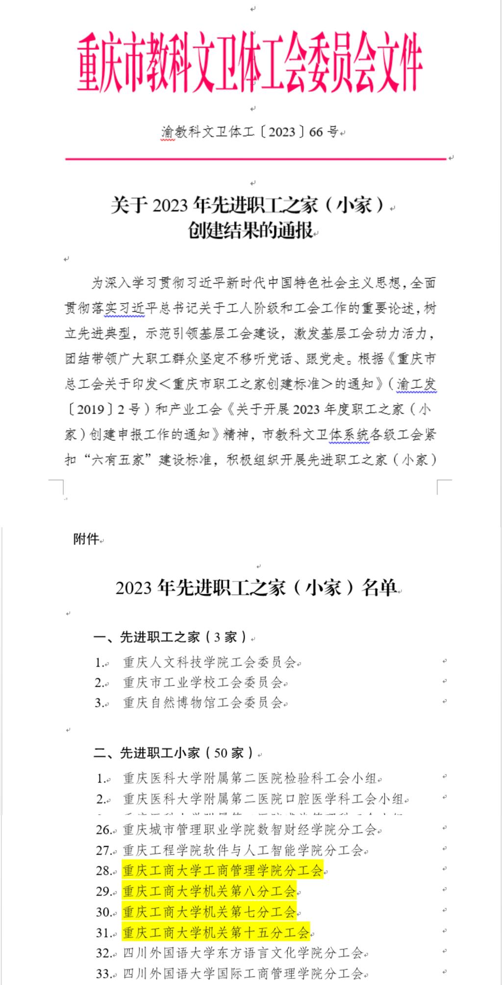 同时,重庆市教科文卫体工会委员会发布《关于2023年先进职工之家(小家)创建结果的通报》,金年会工商管理学院工会、机关工会第七分工会、机关工会第八分工会、机关工会第十五分工会四家职工小家荣获重庆市教科文卫体工会系统先进职工小家荣誉称号。