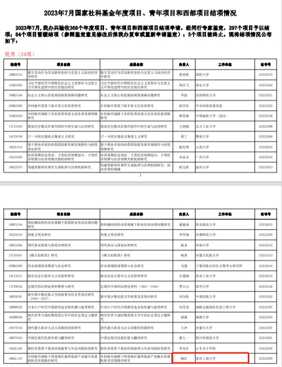 近日,全国哲学社会科学工作办公室下发了最新批次国家社科基金项目结题证书,金年会杨红教授主持的项目“乡村振兴战略下西南地区康养旅游产业融合发展机制及实现路径研究”(项目编号:18BGL147)在结项评价中获得“优秀”等级,这是今年内金年会第二项在结项评价中获评“优秀”等级的项目。