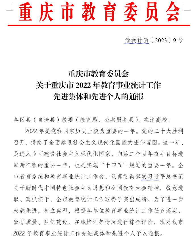 近日,重庆市教育委员会公布了《关于重庆市2022年教育事业统计工作先进集体和先进个人的通报》,金年会被评为重庆市2022年教育事业统计工作先进集体,学校党政办任鹏飞同志荣获重庆市教育事业统计工作先进个人。