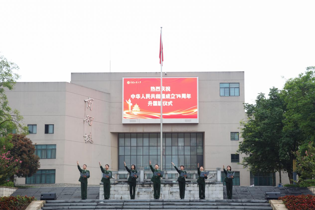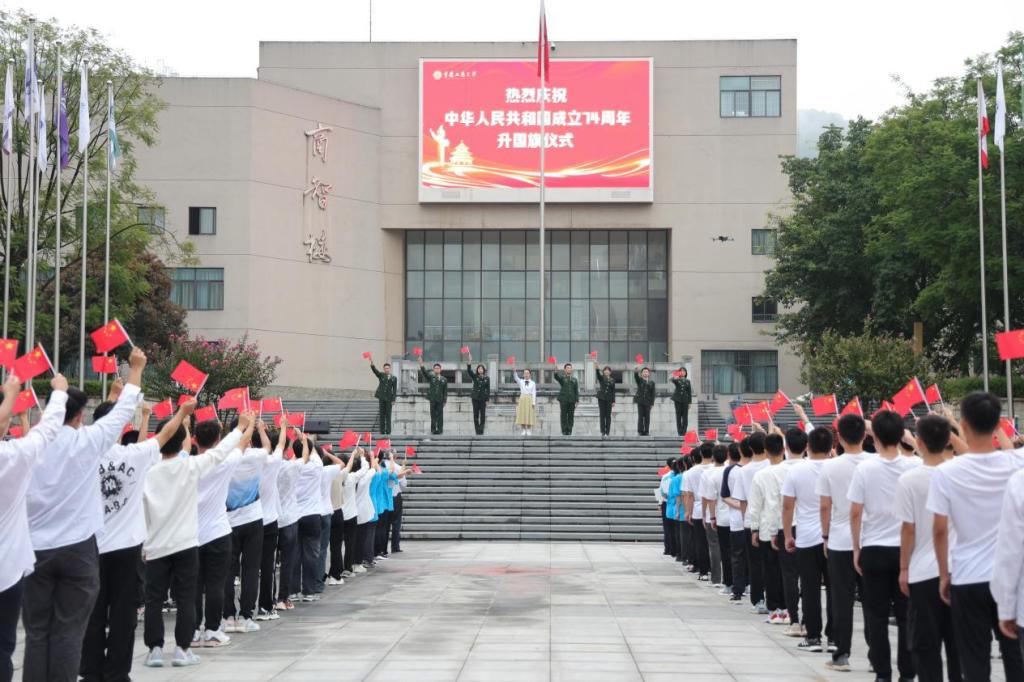 为庆祝中华人民共和国成立74周年,10月1日清晨,金年会在含弘广场隆重举行国庆升旗仪式。