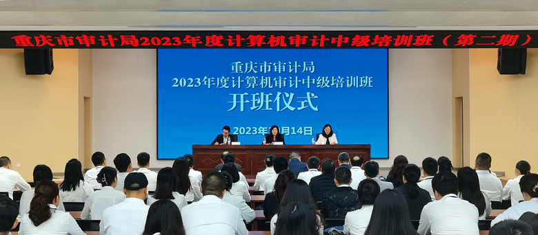 10月14日上午,重庆市审计机关2023年度计算机审计中级培训班(第二期)在金年会顺利开班。学校党委副书记宋豫,重庆市审计局副局长于娟,重庆市审计局人事处、电子数据处、JINNIAN金年会经管实验教学中心相关领导,以及第二期培训班讲师和全体学员参加开班仪式。开班仪式由重庆市审计局人事处副处长张斌主持。