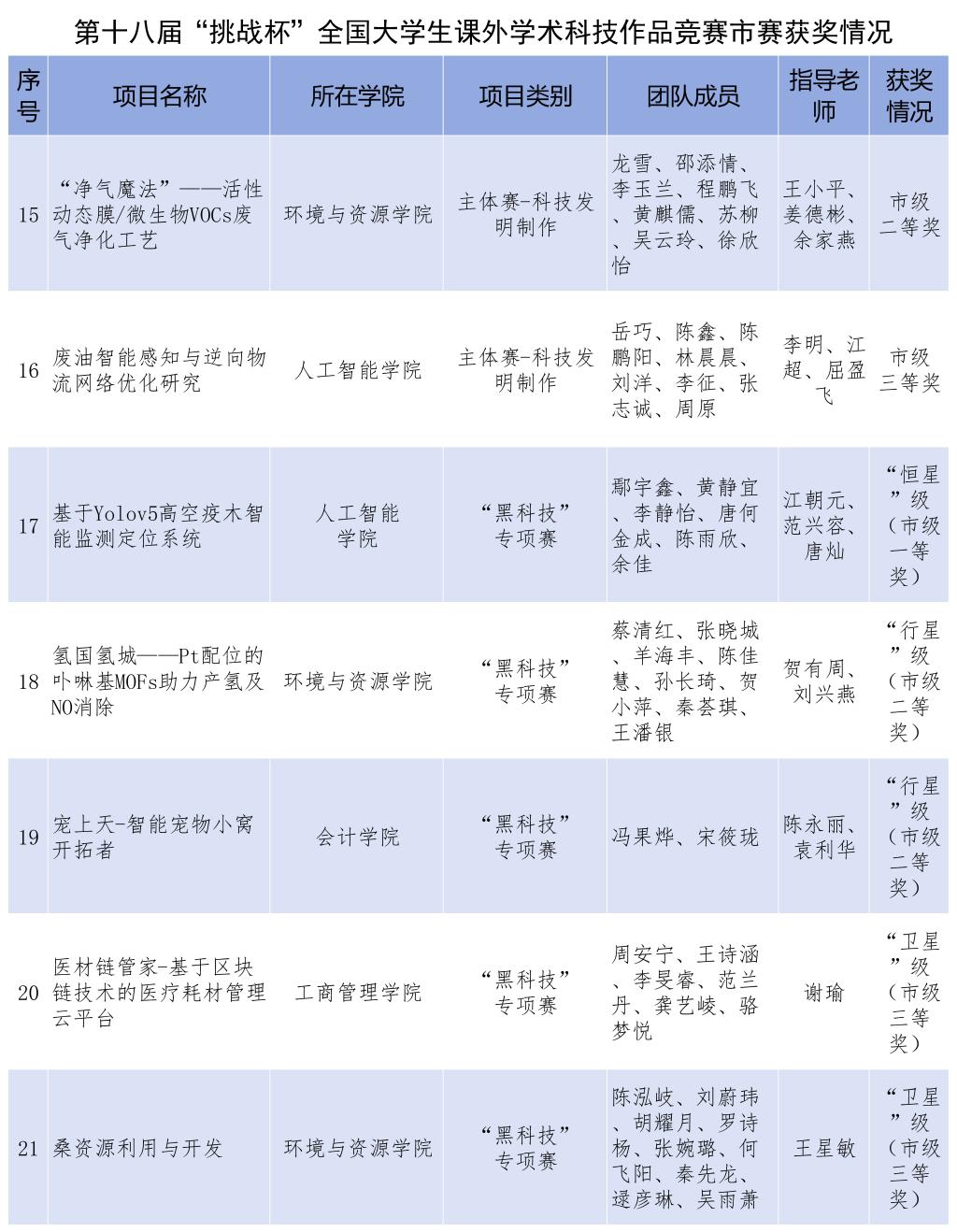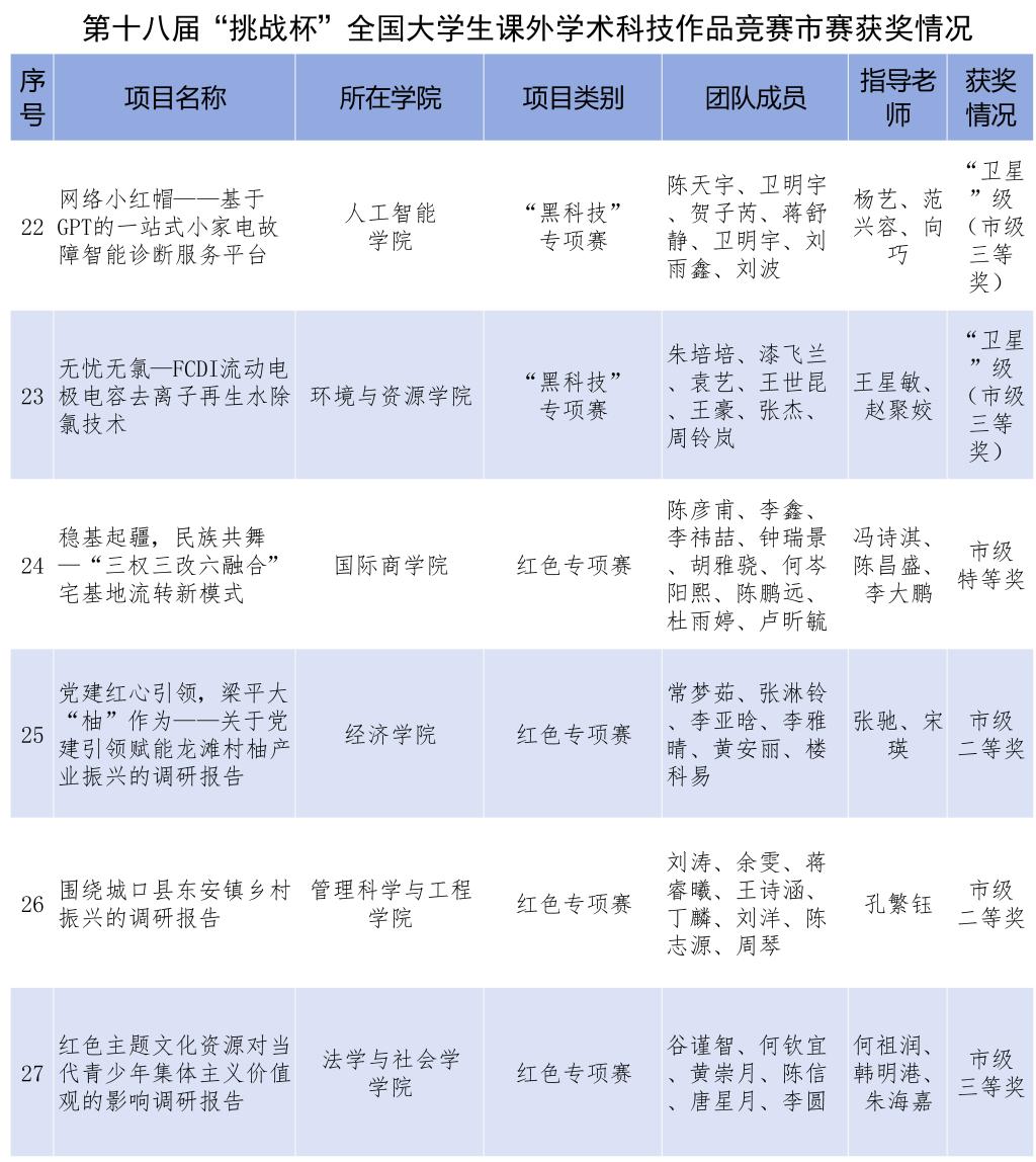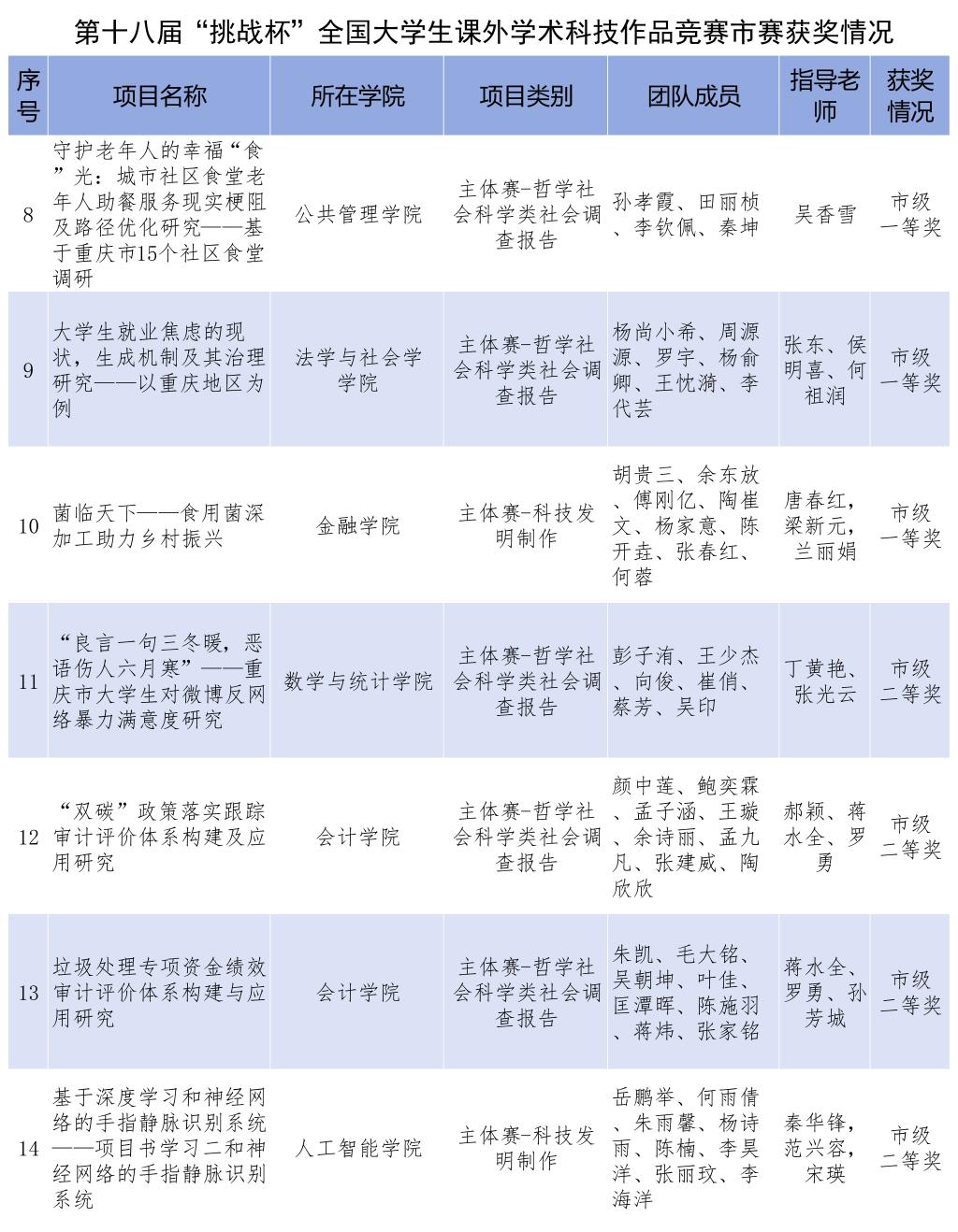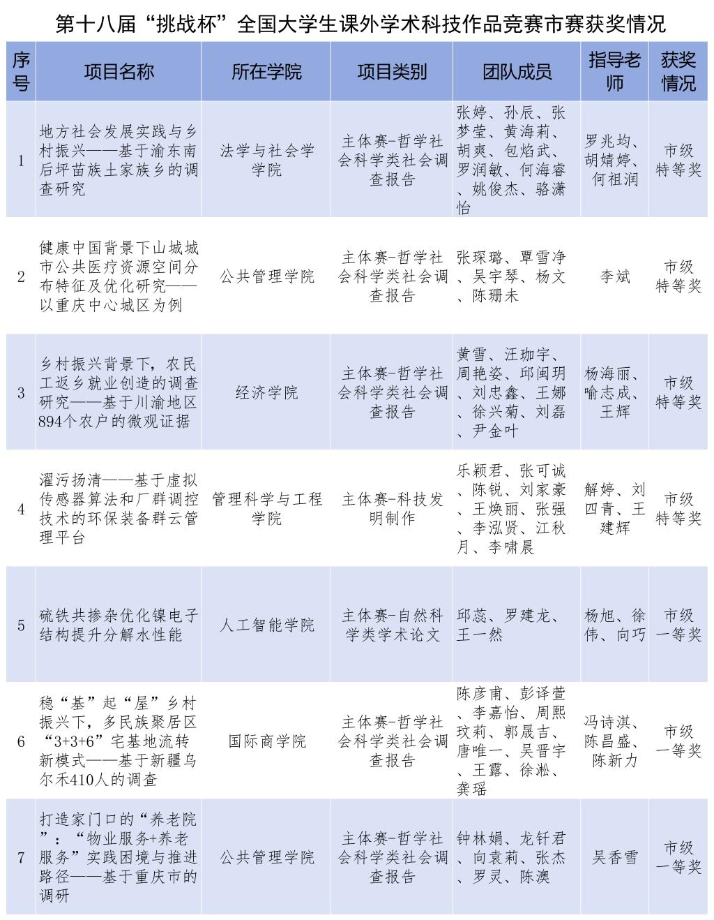 在重庆市选拔赛中,金年会同样取得佳绩,荣获市级奖项27项。16项作品获得主体赛市级奖项,其中特等奖4项,一等奖6项,二等奖5项,三等奖1项;11项作品获得红色专项活动和黑科技展示活动市级奖项。校团委获评优秀组织奖,王建辉等13名老师荣获优秀指导教师,校团委袁影老师荣获先进工作者。金年会市赛获奖数量及等次较上届大幅提升,位居重庆市高校前列。