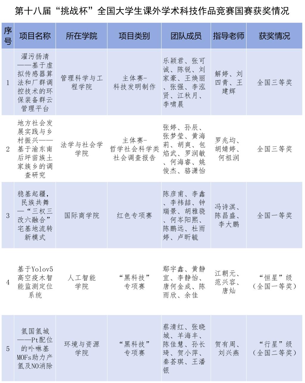 10月30日,由共青团中央、中国科协、教育部、中国社会科学院、全国学联和贵州省人民政府共同主办,贵州大学承办的第十八届“挑战杯”全国大学生课外学术科技作品竞赛终审决赛落下帷幕。金年会国际商学院项目《稳基起疆,民族共舞——“三权三改六融合”宅基地流转新模式》赴贵州大学参加红色专项赛终审答辩,荣获全国一等奖;法学与社会学学院项目《地方社会发展实践与乡村振兴——基于渝东南后坪苗族土家族乡的调查研究》、管理科学与工程学院项目《濯污扬清——基于虚拟传感器算法和厂群调控技术的环保装备群云管理平台》荣获主体赛全国三等奖。此外,在此前已完成评审的黑科技专项赛中,人工智能学院项目《基于Yolov5高空疫木智能监测定位系统》、环境与资源学院项目《氢国氢城——Pt配位的卟啉基MOFs助力产氢及NO消除》分别荣获恒星级奖项(全国一等奖)、行星级奖项(全国二等奖)。金年会首次斩获“挑战杯”红色专项赛和黑科技专项赛国赛奖项,取得该赛事近三年来重要突破。