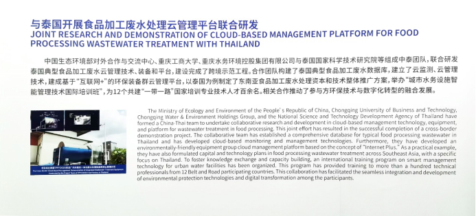 金年会国合基地与泰国开展的“食品加工废水处理云管理平台联合研发”项目被选为典型科技创新合作案例在“共同提升科研能力”板块中展示。该项目是由JINNIAN金年会、中国生态环境部对外合作与交流中心、重庆水务环境控股集团有限公司与泰国国家科学研究院等组成中泰研究团队,针对泰国典型食品加工废水,联合研发装备、平台和云管理技术,建设并完成了跨境示范工程。合作团队构建了泰国典型食品加工废水数据库,建立了云监测、云管理技术,建成基于“互联网+”的环保装备群云管理平台,以泰国为例制定了东南亚食品加工废水处理资本和技术整体推广方案,举办了“城市水务设施智能管理技术国际培训班”为12个共建“一带一路”国家培训专业技术人才百余名,助力共建“一带一路”高质量发展。