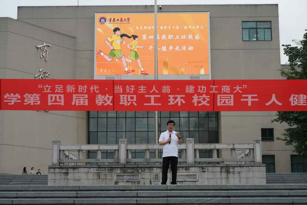 比赛正式开始前,所有参赛教职工在校前广场集合,伴随着激昂的音乐开始了出发前的热身活动。热身结束后,曾维伦致辞。他在讲话中谈到,此次健步走活动既是一次学校工会活动,也是一次具有象征意义的活动。他指出,当前学校和全体教职工们正面临三个“出发”:一是党的二十大擘画了宏伟蓝图,党团结带领全国各族人民,向着全面建成社会主义现代化强国、实现第二个百年奋斗目标,以中国式现代化全面推进中华民族伟大复兴的新征程出发;二是重庆市委六届二次全会对标对表党的二十大精神和习近平总书记的殷殷嘱托,系统谋划新时代新征程新重庆的宏伟蓝图,3千多万重庆人民正向着新征程出发;三是学校第四次党代会提出了学校建设现代化高水平大学的目标,全体重工商大人心系这一目标任务,正向着进一步推动学校高质量内涵式发展的新征程出发。曾维伦谈到,不忘初心、方得始终,希望教职工们以一往无前的决心,在申请博士学位授予单位和推动茶园新校区建设等重大任务赛道上跑出加速度、实现新突破,弘扬“含弘自强 经邦济民”的重工商大精神,向着新的目标再出发。
