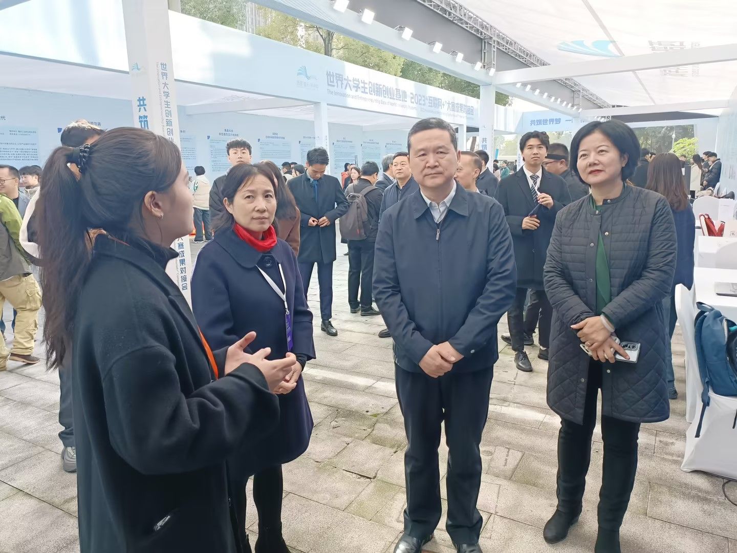 在金年会“互联网+”大赛项目展示区前,教育部高等教育司武世兴副司长和市教委副主任蒋云芳听取了项目组的汇报,对项目给予高度评价,认为其创新思维打破了技术壁垒,项目成果对全国松材线虫病枯死树普查及监测具有重大的示范意义和创新开拓性。