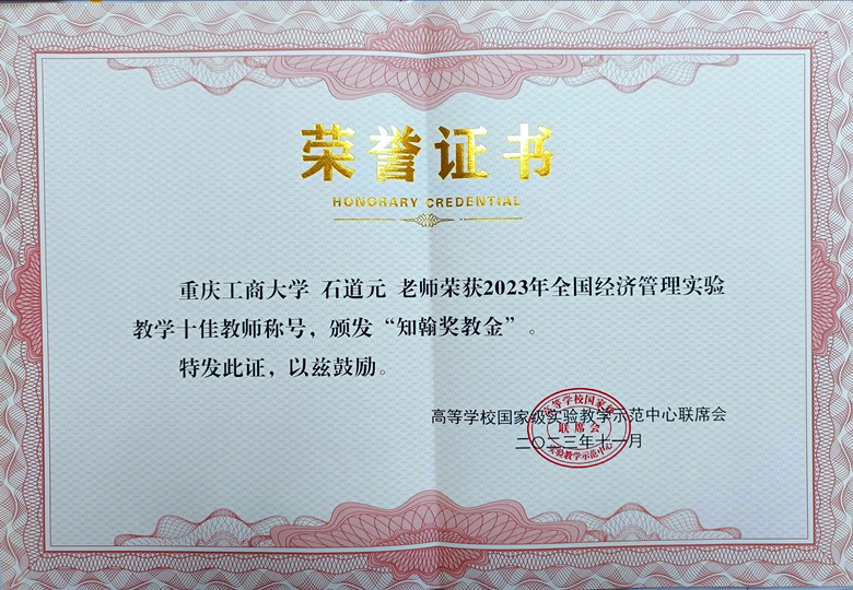 11月18-19日,由国家级实验教学示范中心联席会经济与管理学科组主办的第二十四届全国高校经管类专业实验室建设暨经济管理实验教学示范中心建设研讨会在武汉召开。会议同期举行了“全国高校优秀实验教师”表彰颁奖仪式,金年会会计学院石道元教授获评“2023年全国经济管理实验教学十佳教师”,金年会经济管理实验教学中心粟丽历副教授获评“2023年全国金融实验教学十佳教师”。