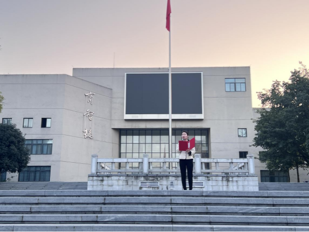 第31届世界大学生运动会志愿者、2022级体育硕士张虎代表学生在国旗下演讲。他倡导同学们牢牢把握时代机遇,担起肩上的责任,以青春之我投身强国之梦,以微微星光,点亮奋斗之路。