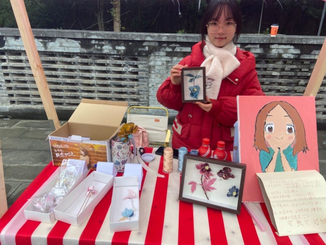 来自大三的文茜在现场演示了非遗缠花,其制作的胸针和装饰画样式精美,供不应求,文茜表示:“这是我第一次参加这样的活动,平时更多的时候是在自己的寝室进行一些创作,没想到大家这么喜欢我的作品,很感谢学校的提供的集市活动机会,也让我对非遗和手工艺行业有了更多的畅想。”