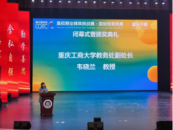 闭幕式上,重庆大山汽车配件有限公司MIKE先生和重庆传音通讯技术有限公司人力资源部总监陈蓉女士代表赛事评委进行点评,他们赞扬参赛同学们的精彩表现,鼓励同学们积极拓宽自身视野、培养学科思维逻辑、提升专业综合素养,继续在国际贸易竞赛中发光发热。