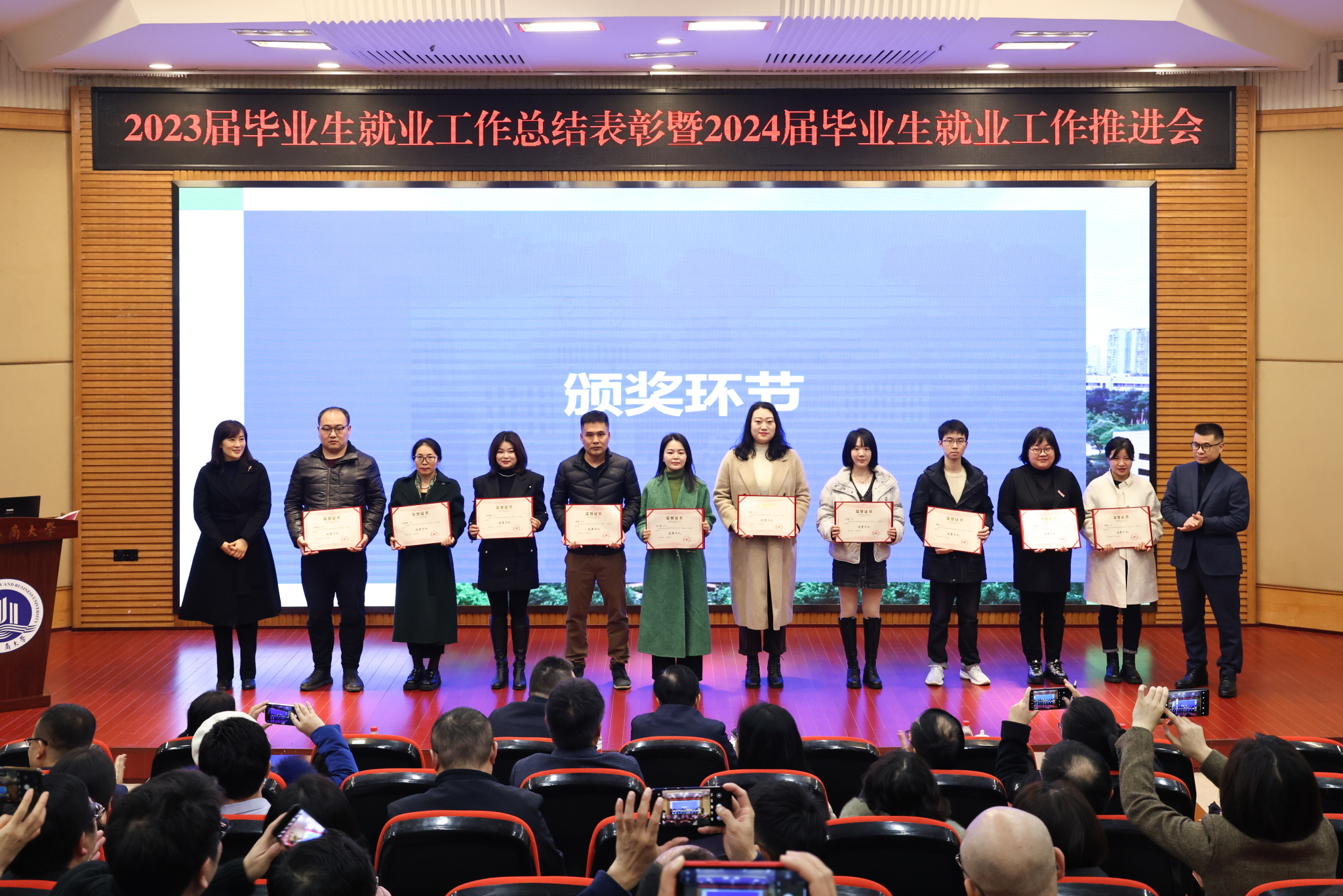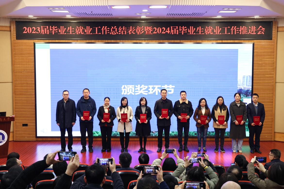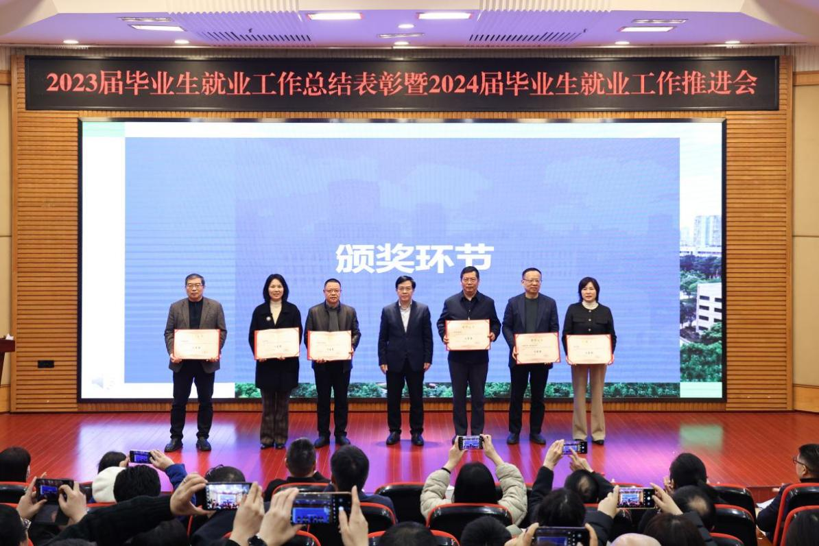 陈运超宣读了JINNIAN金年会《关于表彰2023届本科毕业生就业工作先进集体、优秀个人的决定》。陈运超、柏群为获得“就业工作优秀个人”的毕业班辅导员、就业工作联络员颁奖;李敬、张海燕为获得“就业工作优秀个人”的专任教师颁奖;温涛为获得“就业工作优秀个人”的中层干部颁奖;曾维伦为体育学院、环境与资源学院、金融学院、公共管理学院、经济学院、外国语学院6个荣获2023届本科毕业生就业工作先进集体的学院颁奖。