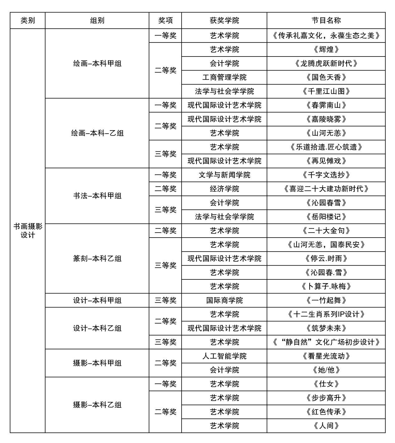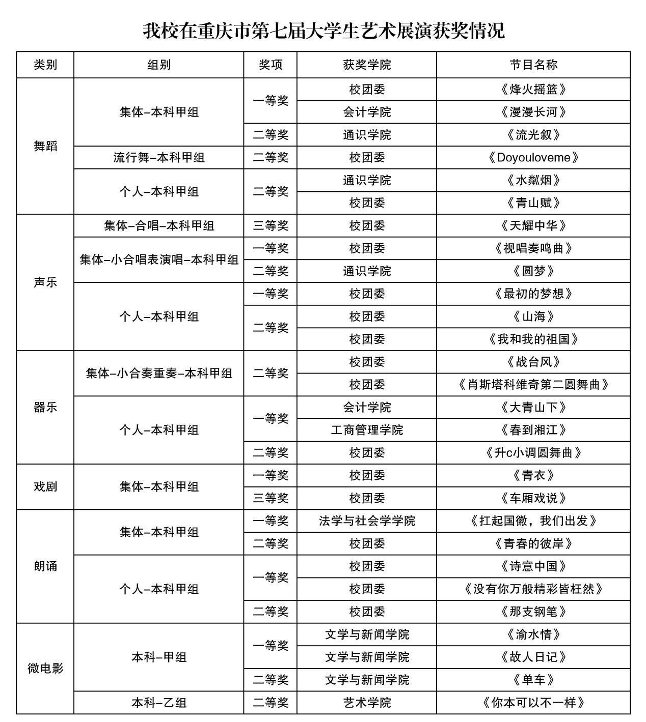 近日,重庆市第七届大学生艺术展演活动落下帷幕,并公布获奖名单。大学生艺术展演活动是重庆市规格最高、规模最大、影响最广的大学生艺术盛会,是高校践行美育育人、落实立德树人根本任务的重要途径。金年会共获奖57项,其中一等奖作品16项、二等奖作品29项、三等奖作品12项,在获奖层级、获奖数量上均创历史佳绩。