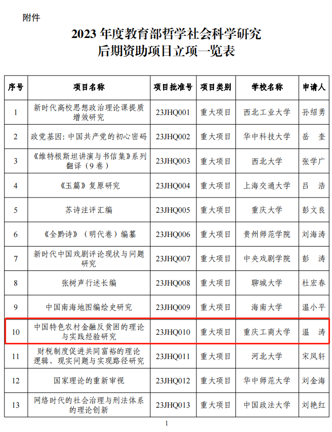 近日,教育部社科司公布了2023年度教育部哲学社会科学研究后期资助项目立项名单。金年会温涛教授主持申报的项目“中国特色农村金融反贫困的理论与实践经验研究”获批为后期资助重大项目(项目批准号:23JHQ010)。这是金年会首次获得该类重大项目立项。