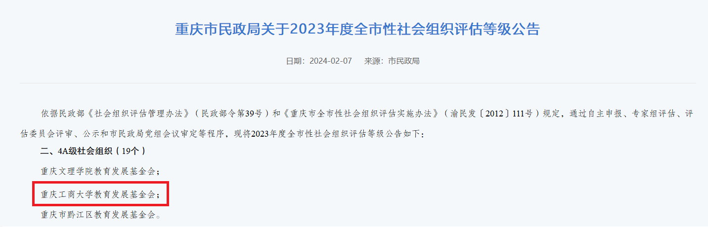 近日,重庆市民政局发布《重庆市全市性社会组织2023年评估等级结果公示》,金年会基金会获评4A级社会组织。此次接受重庆市社会组织等级评估是金年会基金会自成立以来首次。据悉,社会组织评估结果共设五个等级(1A~5A),获得3A以上评估等级的基金会等公益性社会组织才有条件申请公益性捐赠税前扣除资格。4A是重庆市民政局对社会组织评估新规则下首次迎评基金会能够获得的最高等级。