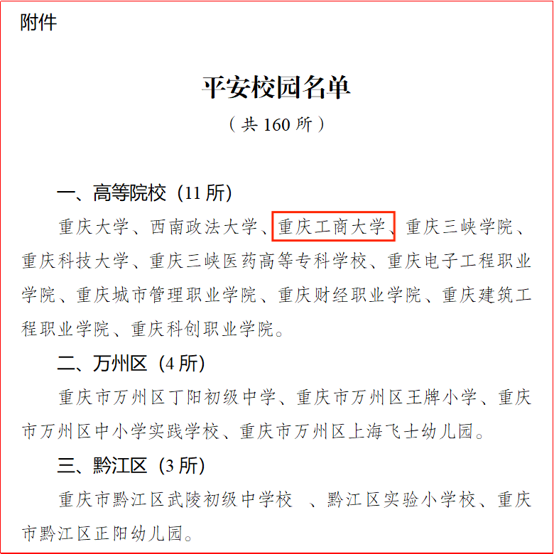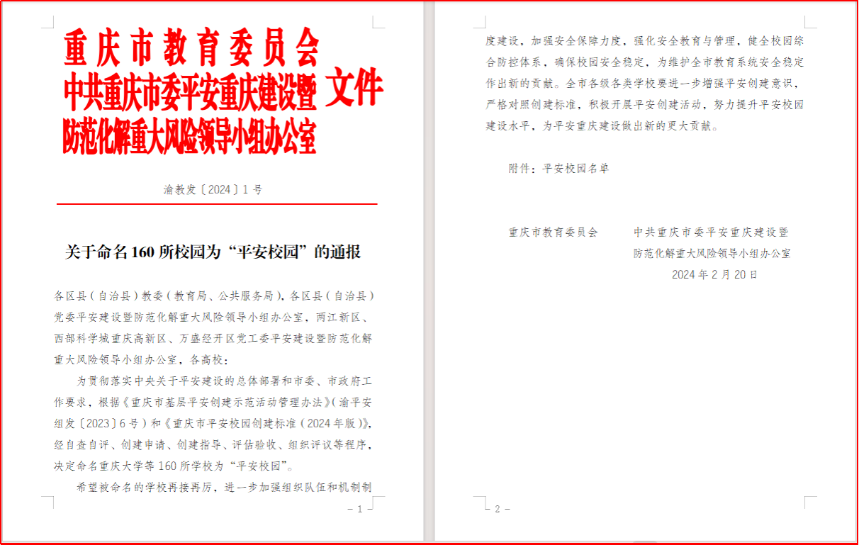 2月20日,重庆市教育委员会、中共重庆市委平安重庆建设暨防范化解重大风险领导小组办公室联合印发《关于命名160所校园为“平安校园”的通报》(渝教发〔2024〕1号),决定命名全市160所学校为“平安校园”,其中,高等院校11所(本科院校5所,高职专科6所),金年会位列本科院校第3名。