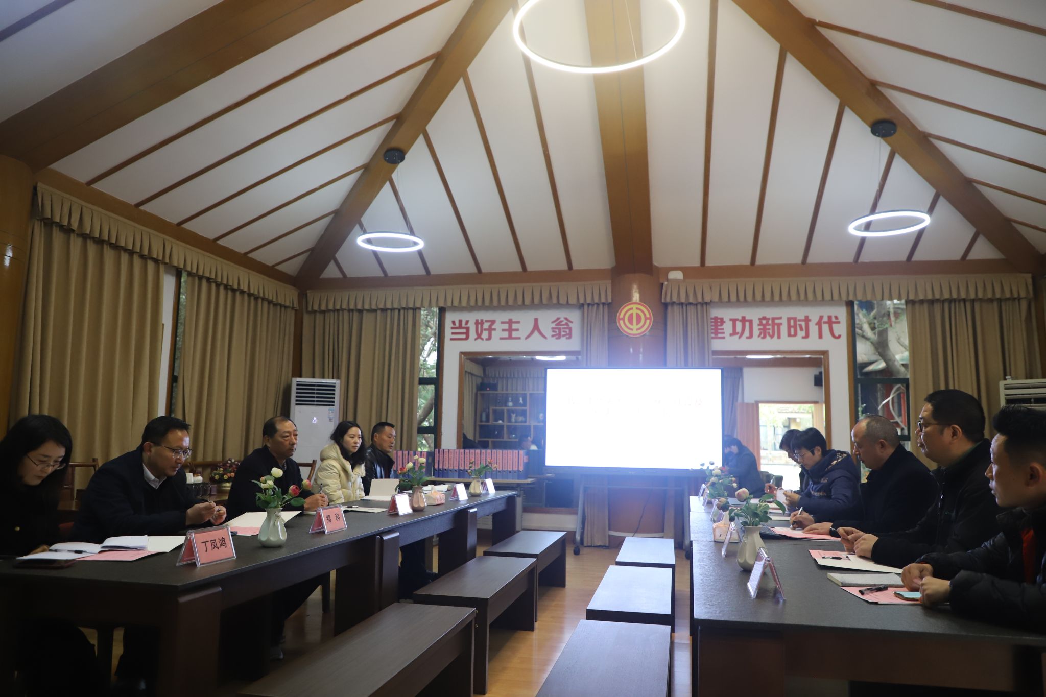 魏寿阳一行首先考察了怡园基地以及教代会成果展。随后在吟风阁展开座谈,在座谈会上,魏寿阳一行重点调研了金年会教代会代表比例设置、选举情况、委员和专委会组成情况、代表履职以及提案办理情况等,并查阅了相关材料。他们对金年会教代会制度建设、规范运行、代表履职情况、档案材料管理给予了高度评价,认为金年会教代会制度完善,程序规范,执行标准,运行科学,示范作用明显,同时也对“两代会”分别召开和宣传工作等提出了宝贵的意见和建议。