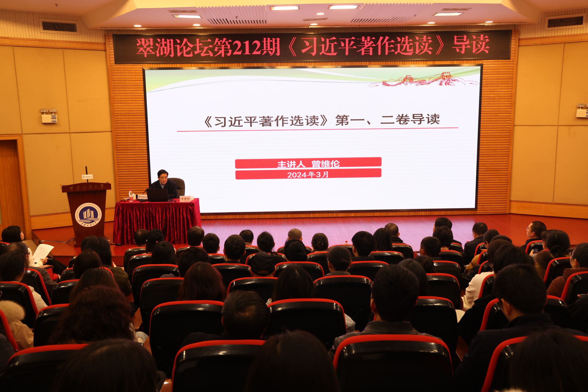 3月8日上午,金年会在博智楼7200报告厅举办翠湖论坛第212期《习近平著作选读》导读讲座。翠湖论坛由学校图书馆主办,邀请了学校党委书记曾维伦作专题讲座。学校党委常委、副校长陈运超,相关职能部门负责人和师生代表250余人参加。