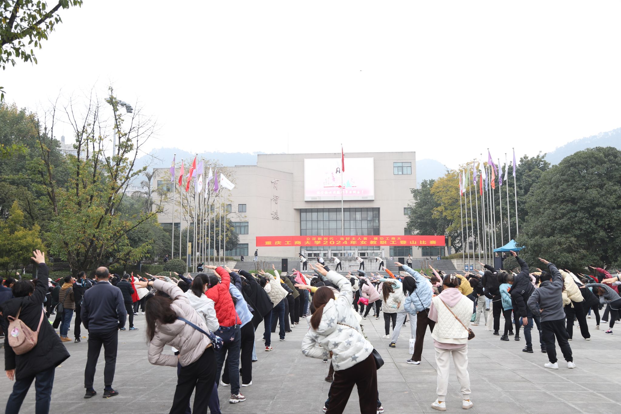 热身活动后,曾维伦致辞。他首先代表学校党委、行政向全校女教职工致以节日的祝福。曾维伦在讲话中谈到,新中国成立后特别是改革开放以来,中国社会的发展日新月异,女同胞的地位显著提升,获得感、幸福感、安全感与日俱增。近年来,学校的女同胞们以强烈的主人翁意识和饱满的工作热情投身工作,为学校事业高质量发展贡献智慧和力量,充分发挥了“半边天”作用,重工商大女同胞们,何其给力。2024年是中华人民共和国成立75周年,是实现“十四五”规划目标任务的关键一年,是现代化新重庆从全面部署到纵深推进的重要之年,也是学校改革攻坚突破年,希望大家拿出登山的劲头,以拼搏的状态,务实的作风,开拓进取,真抓实干,为学校不断开创建设现代化高水平大学高质量发展新局面作出“巾帼”贡献。