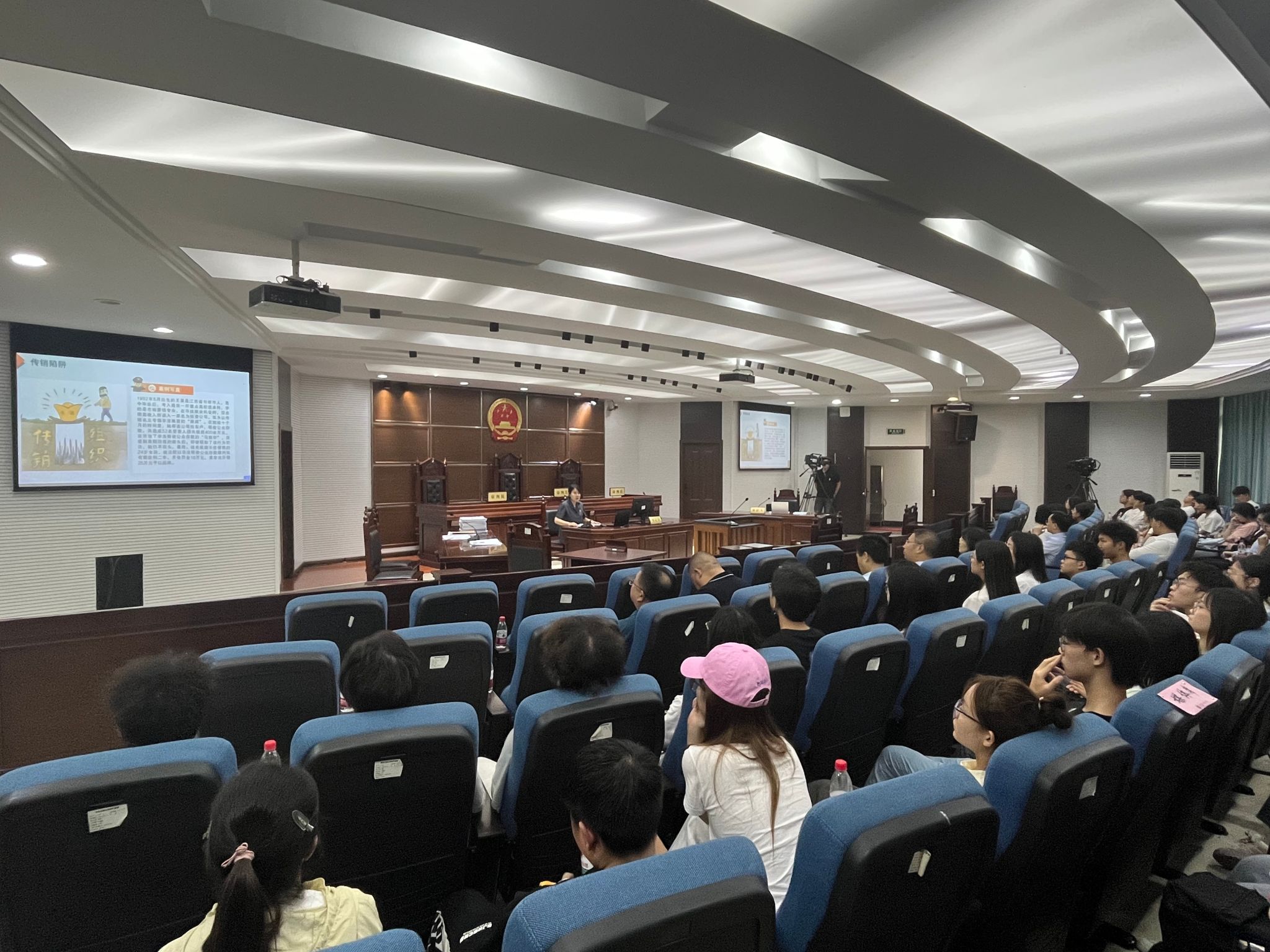 休庭评议期间,重庆五中院刑二庭法官助理黄铱还结合庭审案例及日常工作中典型案例,以大学生暑期应聘兼职以及就业如何避免诈骗为主题,从认清各类陷阱、增强防骗意识等方面为同学们进行普法宣讲,并结合自身工作经验与同学们分享了防骗小妙招。