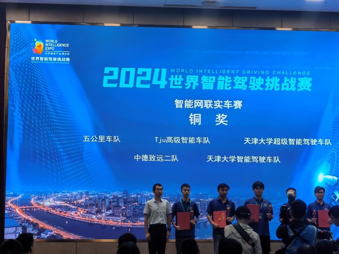 世界智能挑战赛作为世界智能产业博览会三大重磅赛事之一,吸引了来自天津大学、北京理工大学、东南大学等百余支参赛队伍。今年,有19支队伍进入智能网联实车赛决赛,经过激烈角逐,机械工程学院“五公里车队”最终以总分第八名获得铜牌(大赛设金奖3个、银奖4个、铜奖5个)。