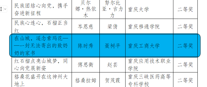 近日,市教委、市委统战部、市民族宗教委通报了全市教育系统“同心跟党走,巴渝石榴红”铸牢中华民族共同体意识教育征文活动的评选结果,金年会学生陈时秀的作品《在山城,遥念索玛花——一封无法寄出的致奶奶的家书》(指导教师:聂树平)获二等奖。